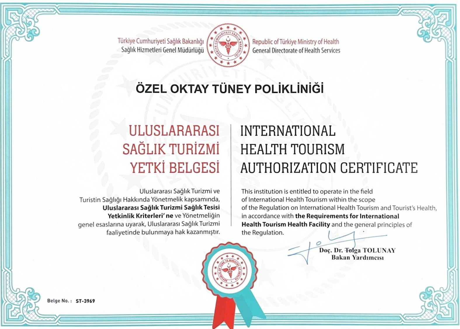 Oktay TUNEY Polikliniği, Uluslararası Sağlık Turizmi ve Turistin Sağlığı Hakkında Yönetmelik kapsamında, Uluslararası Sağlık Turizmi Sağlık Tesisi Yetkinlik Kriterleri’ ne ve Yönetmeliğin genel esaslarına uyarak, Uluslararası Sağlık Turizmi faaliyetinde bulunmaya hak kazanmıştır.